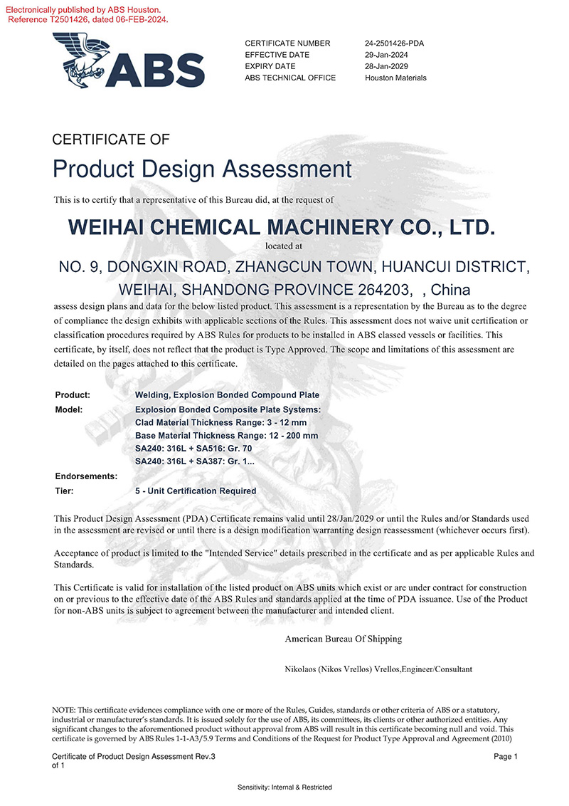 近日,威?;瘷C(jī)順利獲得美國船級社(ABS)頒發(fā)的產(chǎn)品設(shè)計(jì)PDA認(rèn)可證書,認(rèn)可產(chǎn)品名稱為“爆炸焊接復(fù)合板”,涵蓋產(chǎn)品種類:ASME SA264、ASME SA265、ASTM B898標(biāo)準(zhǔn)…